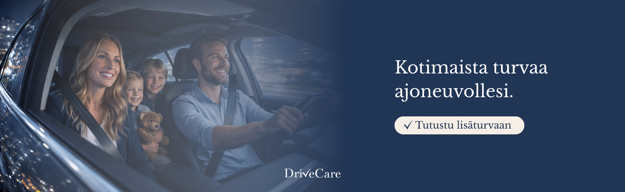 Drivecare tarjoaa kotimaista lisäturvaa ajoneuvoosi. Olemme suomalainen ja tunnemme Suomen vaihtelevat ajo-olosuhteet. Lisäturvamme on suunniteltu nimenomaan suomalaisille autoilijoille.